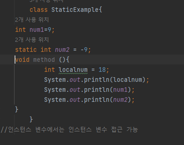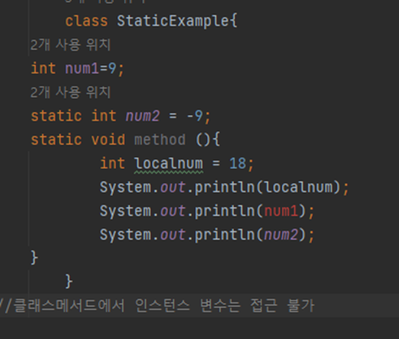 또 정적 메서드의 경우 인스턴스 변수 또는 인스턴스 메서드를 사용할 수 없다.