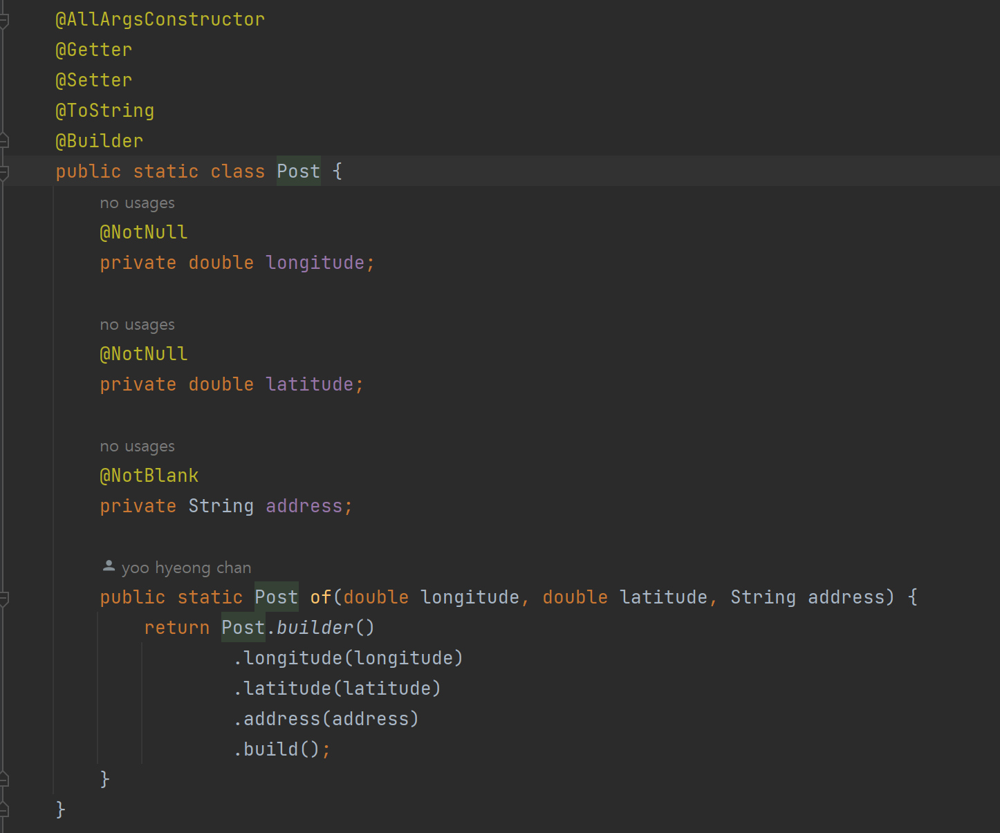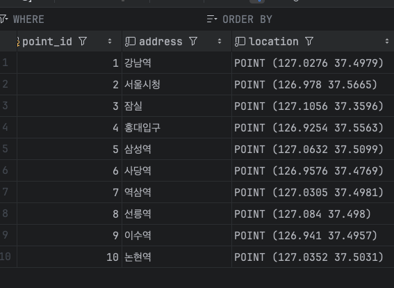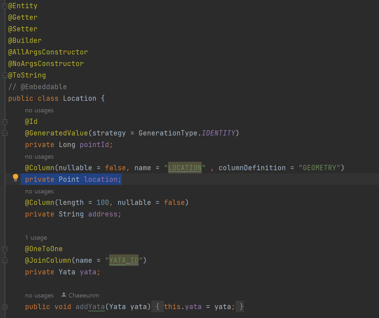 Location Entity에 포인트 타입 필드를 추가해주었다