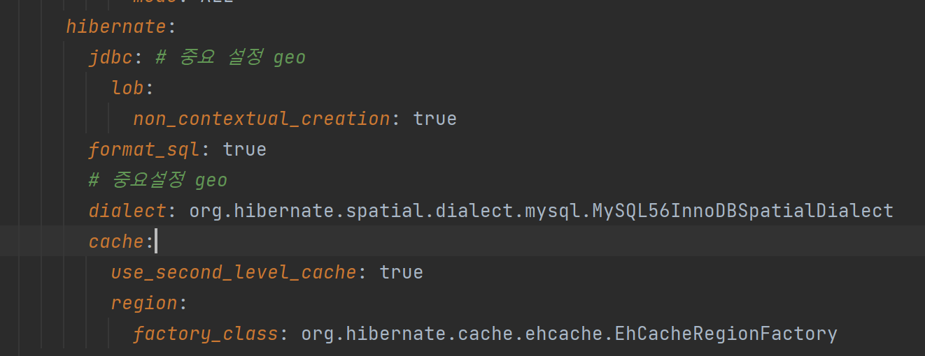 => MySAL 5.6 이상 버전과 InnoDM스토리지 엔진을 사용하는 MYSQL 데이터베이스의 공간 확장 기능을 지원. 이 기능을 사용하면 Hibernate가 MySQL의 공간 데이터 유형(Geometry,Point,Polygon 등)과 공간 함수(ST_*,MBR 등)을 사용할 수 있게 된다. 즉 Hibernate를 통해 공간 데이터를 쿼리하고 처리할 수 있게 되는 것이다.