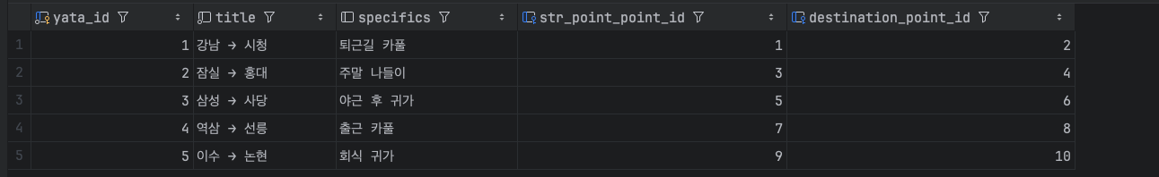 출발지가 강남역에서 5km 반경 안에 있는(강남역/삼성역) 게시물이 가져와졌다.