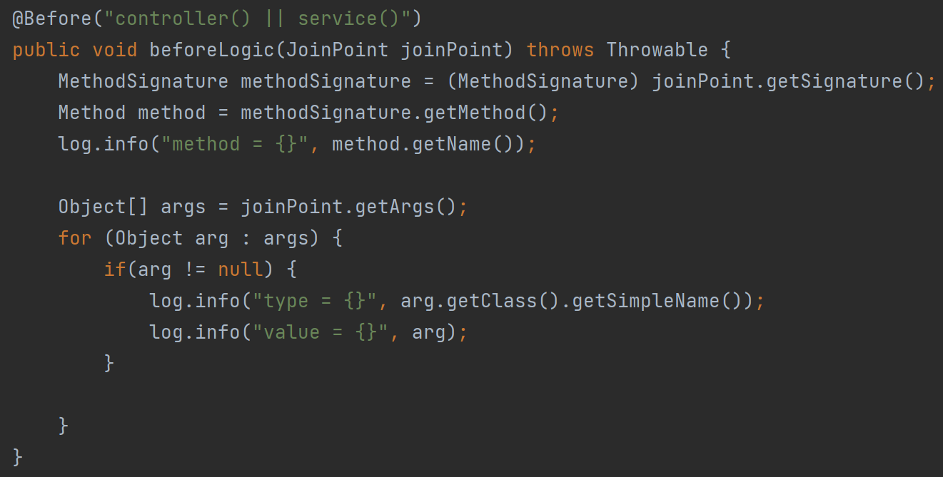 public void beforeLogic(JoinPoint joinPoint) throws Throwable {