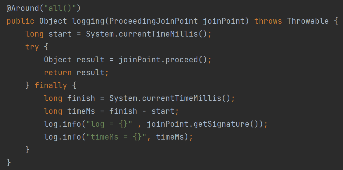 joinPoint.proceed() -> Advice가 적용된 메서드 실행 수 결과 반환, 결과 result에 저장