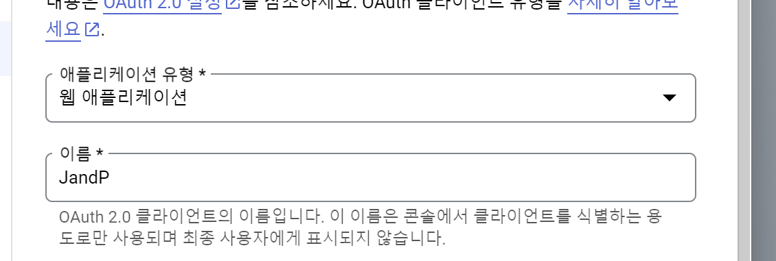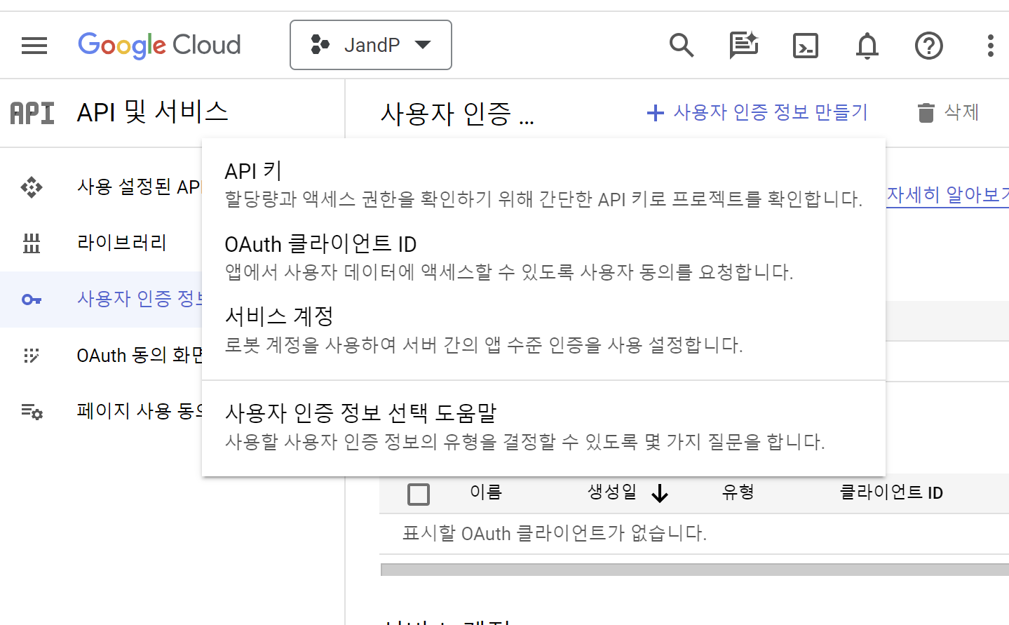 API및 서비스 -> 사용자 인증 정보 -> 사용자 인증정보 만들기 -> Oauth 클라이언트 ID 클릭