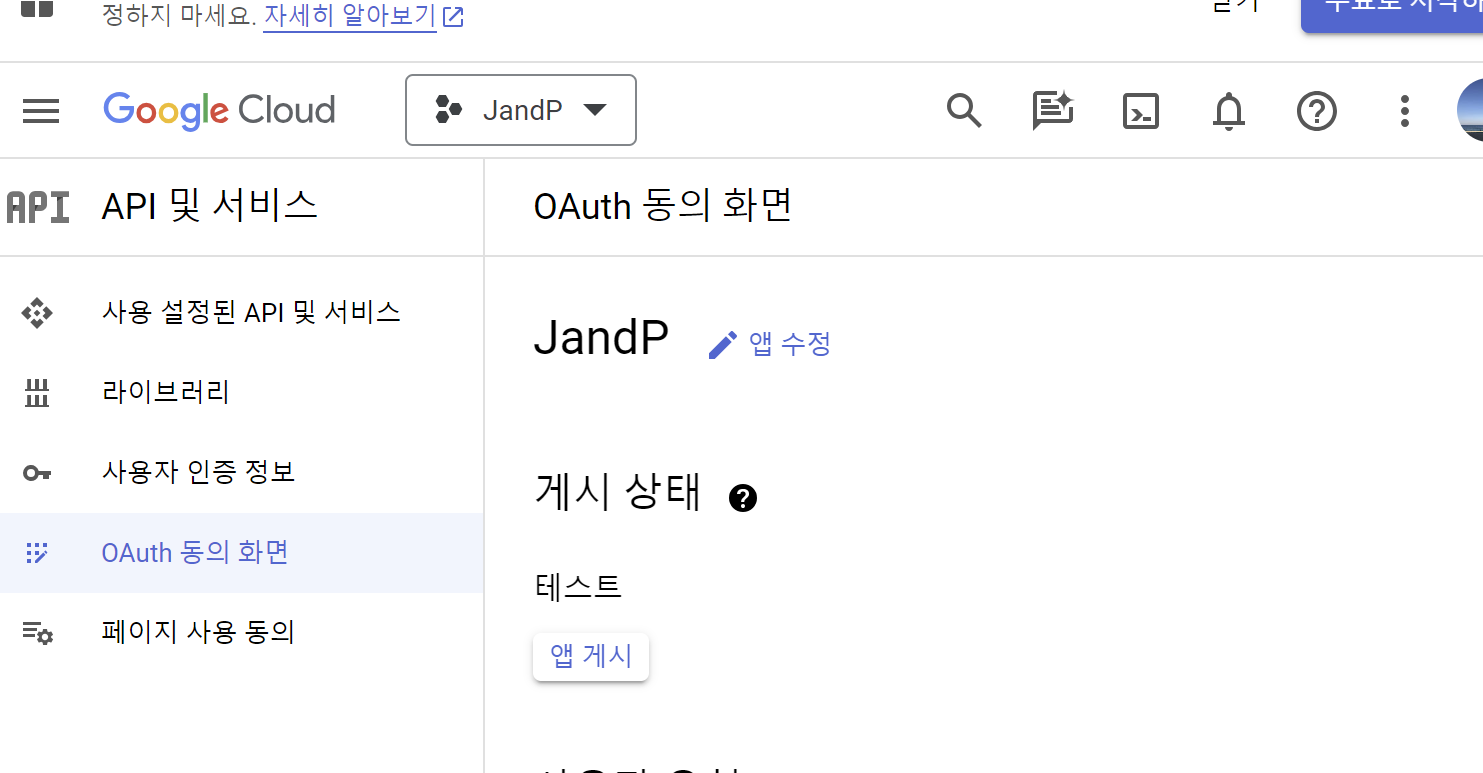 API 및 서비스 -> Oauth 동의 화면 -> 외부 선택 -> 만들기