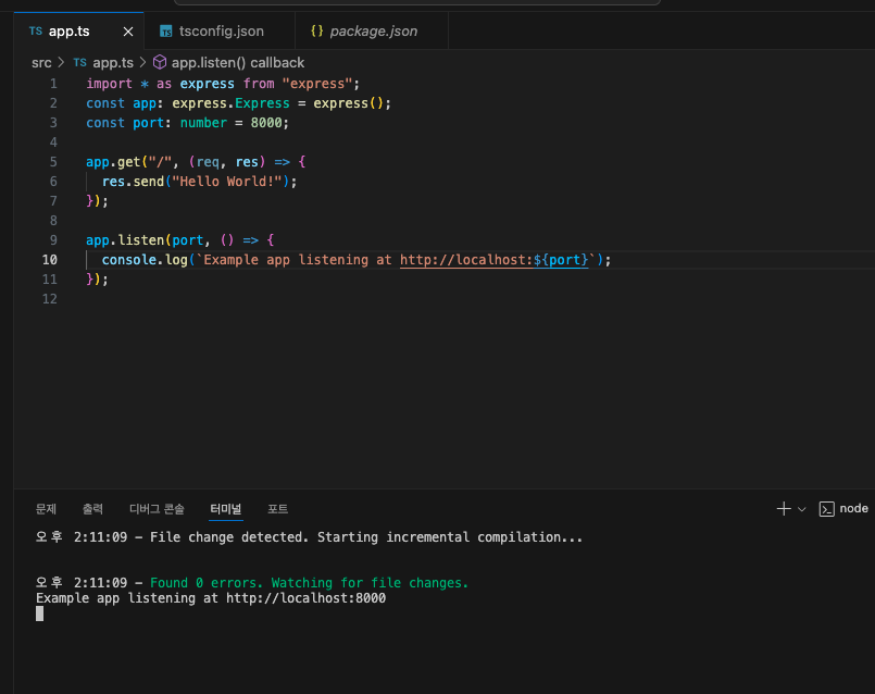 "start:dev": "tsc-watch --onSuccess \"node dist/app.js\"", -> npm run start:dev 실행 시 해당 명령어 실행 tsc로 계속 컴파일을 했을 때 성공했다면 다음 명령어 실행 node 로 dist 폴더 안에 있는 app.js를 실행해라 (dist는 tsconfig에서 컴파일 옵션에 따라 컴파일 하는데 이때 설정해준 폴더임)